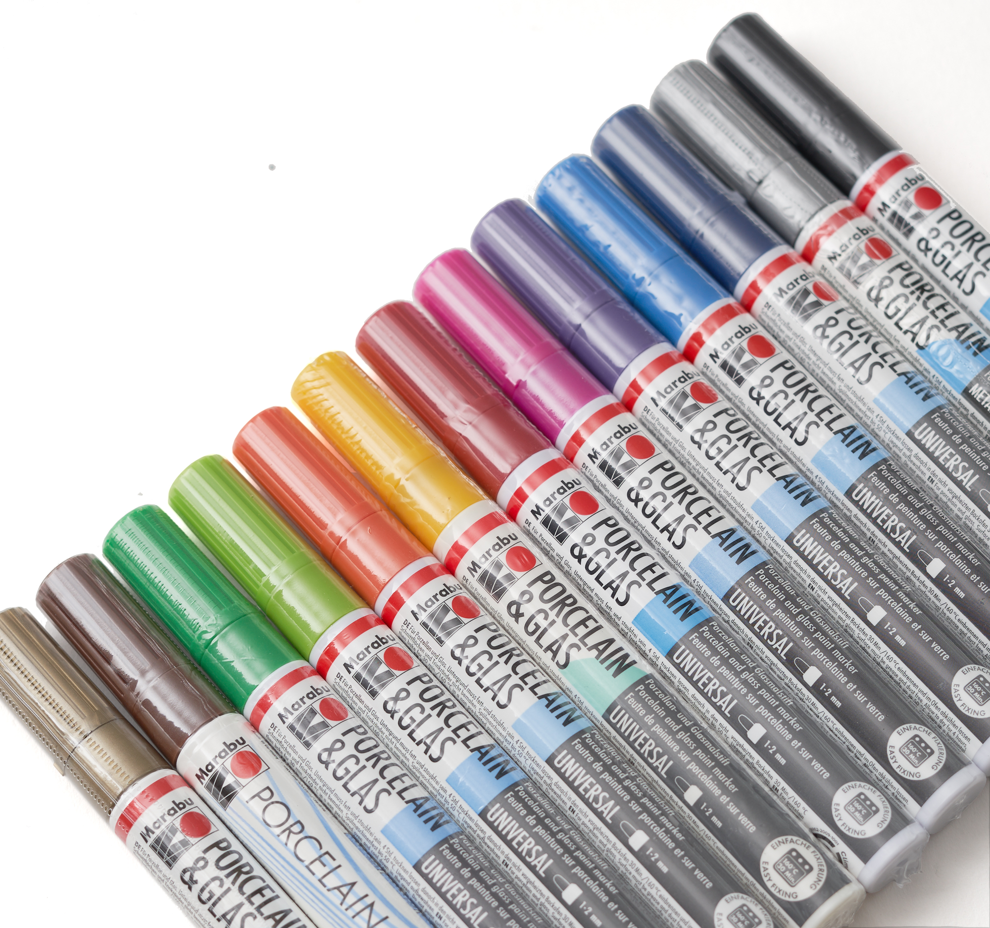 Rotulador brillante para cerámica y vidrio de amplia gama de colores. Disponible en punta de 1 mm en negro para detalles finos y 12 colores con punta de 1-2 mm para superficies mayores. Resistente al lavavajillas y no tóxico. Recomendamos consultar la hoja de información para su utilización.
